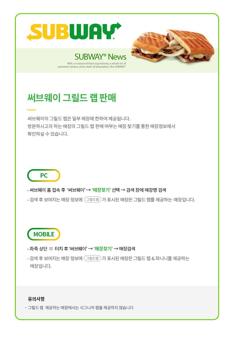 써브웨이 그릴드 랩 일부 매장 판매 안내